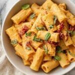 - Create the Sauce: Add the reserved pasta water, sun-dried tomatoes, and nutritional yeast into the baking dish. Stir thoroughly to develop a creamy, flavorful sauce.