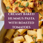 Keywords: baked hummus pasta, roasted tomato pasta, vegan pasta recipe, hummus sauce, healthy pasta, Mediterranean pasta, plant-based pasta