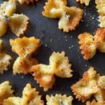 Crispy and flavorful Pasta Chips made from bow tie pasta, seasoned with parmesan and Italian herbs, baked to perfection, and served with warm marinara sauce for a delicious and unique snack or appetizer.