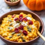 - Serve and Garnish: Serve the baked pumpkin goat cheese risotto topped with the reserved crumbled goat cheese, dried cranberries, pumpkin seeds, and an extra sprinkle of chopped sage and rosemary for garnish and added aroma.