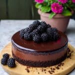 A round chocolate cake with two clear layers is shown on a light wooden board. The bottom layer is a dark, crumbly chocolate base. The top layer is smooth, glossy chocolate ganache, deep brown in color. On top of the cake, a pile of shiny blackberries adds contrast with their black and deep purple shades. The cake edges show some loose chocolate crumbs. Behind the cake, there is a blurred flower pot with bright pink flowers and green leaves, set on a white marbled textured surface. photo taken with an iphone --ar 4:5 --v 7