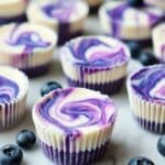 The image shows several small cheesecake bites placed on a white marble surface, each in white cupcake liners. Each cheesecake bite has two visible layers: a purple-blue layer at the bottom with a slightly textured look, likely from blueberries, and a smooth creamy white layer on top. The top layer has swirling patterns in bright purple and white, creating a marbled effect that varies slightly for each bite. Scattered around the cheesecake bites are whole fresh blueberries, adding a dark blue contrast to the light background. The lighting is soft, highlighting the smooth creamy texture and vibrant swirl colors. photo taken with an iphone --ar 4:5 --v 7