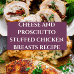 Delicious Cheese and Prosciutto Stuffed Chicken Breasts featuring tender chicken breasts filled with creamy garlic herb cream cheese, savory prosciutto, fresh basil, and sun-dried tomatoes. Perfectly seared in a skillet and finished in the oven, this flavorful dish is simple to prepare and sure to impress.