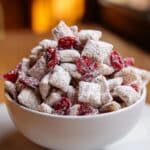 Cherry Cheesecake Puppy Chow is a sweet and crunchy snack mix featuring Chex cereal coated in a creamy cherry-flavored white chocolate mixture, dusted with cheesecake pudding and powdered sugar, and studded with dried cherries. Perfect for parties, movie nights, or anytime you crave a delightful, fruity, and creamy treat.