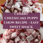 Cherry Cheesecake Puppy Chow is a deliciously sweet and tangy snack mix that combines crunchy cereal with creamy white chocolate and cherry flavors. It’s perfect for parties, movie nights, or anytime you want an easy dessert treat.