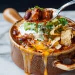 This Chicken Chorizo Chili is a flavorful and hearty red-style chili that combines tender chicken thighs with spicy Mexican chorizo. Rich, smoky, and packed with spices, it’s perfect for a comforting meal anytime. Top it off with lime cilantro sour cream and your favorite garnishes for a delicious finishing touch.