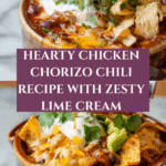 This Chicken Chorizo Chili is a hearty, flavorful red-style chili combining spicy Mexican chorizo and tender chicken thighs simmered with a robust blend of chili powder, cumin, cocoa, and fire-roasted tomatoes. Finished with creamy lime cilantro sour cream and customizable toppings, this stovetop chili is perfect for a comforting meal with bold smoky and spicy notes.