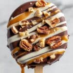 - Dip the Apples: Fully dip each apple slice into melted chocolate up to just past where the stick meets the fruit. Let excess drip off, then place slices in a single layer on the sheet pan. Refrigerate 5–10 minutes until chocolate sets.