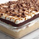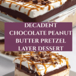 This Chocolate Peanut Butter Layer Dessert combines a crunchy pretzel crust with a creamy peanut butter cheesecake layer, topped with rich chocolate pudding, hot fudge, and whipped topping. It’s a decadent, no-bake layered treat that perfectly balances salty, sweet, and creamy textures for an irresistible dessert.
