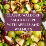 Classic Waldorf Salad is a fresh and crisp fruit and nut salad featuring diced apples, celery, walnuts, and grapes tossed in a creamy mayonnaise and lemon dressing. Served on a bed of lettuce, it’s a perfect light and refreshing side dish or snack.