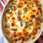 - Assemble in Baking Dish: Transfer the creamy mushroom mixture into a baking dish, spreading evenly. Sprinkle the shredded mozzarella cheese over the top.