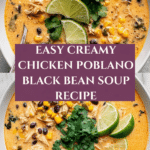 This Easy Chicken, Poblano, and Black Bean Soup is a flavorful and comforting small-batch soup perfect for weeknight dinners. Made with tender shredded chicken, smoky poblano peppers, black beans, and a creamy base enriched with cheese and heavy cream, this soup offers a harmonious blend of textures and spices. The fresh lime juice and cilantro garnish add a bright finishing touch, making it a delightful meal that’s both satisfying and easy to prepare.