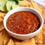 Keywords: homemade salsa, easy salsa recipe, fire roasted salsa, blender salsa, fresh salsa, Mexican salsa, tortilla chips, spicy salsa