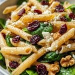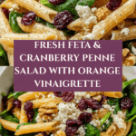 A vibrant and refreshing Feta & Cranberry Penne Salad tossed with a zesty orange vinaigrette. This easy-to-make pasta salad combines the creaminess of feta cheese, the sweet chewiness of dried cranberries, crunchy toasted walnuts, and fresh baby spinach, all brought together with a flavorful citrus dressing perfect for a light lunch or side dish.