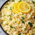 A bright and zesty Greek Lemon Rice recipe featuring fluffy long-grain rice simmered in flavorful vegetable or chicken broth with fresh lemon juice, garlic, and oregano. This simple and vibrant side dish is perfect for Mediterranean-inspired meals, garnished with fresh parsley for an added burst of color and flavor.