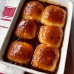 A white rectangular baking dish holds six golden brown biscuit-like pastries, each sitting in a dark, glossy sauce that fills the bottom and edges of the dish. The pastries are puffy with a shiny, slightly cracked surface showing layers of soft, baked dough. The dish is placed on a white marbled surface with a folded white towel that has red stripes on the side. photo taken with an iphone --ar 4:5 --v 7