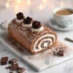 This Gourmet Tiramisu Yule Log Cake features a delicate espresso-flavored sponge cake rolled with a luscious mascarpone and coffee liqueur cream filling. Dustings of cocoa powder enhance both flavor and presentation, making it an irresistible dessert perfect for festive occasions.
