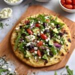 Keywords: Greek pizza, Mediterranean pizza, feta cheese pizza, arugula pizza, sun-dried tomato pizza, easy pizza recipe, vegetarian pizza