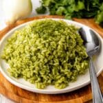 A white plate filled with a mound of green rice, with each grain distinct and coated in a thick green sauce with a slightly chunky texture, piled high in the center. A silver spoon is partially inserted on the right side of the plate. The plate sits on a round wooden board, and in the background, there is a bunch of bright green cilantro and a whole white onion on a white marbled surface. photo taken with an iphone --ar 4:5 --v 7