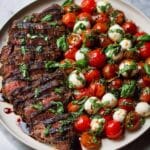 Keywords: grilled flank steak, caprese salad, balsamic dressing, Italian recipe, summer grilling, mozzarella, cherry tomatoes, basil, balsamic glaze