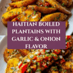 This Haitian-Style Boiled Plantains with Garlic and Onion is a vibrant and flavorful side dish featuring tender boiled green plantains combined with a sautéed medley of garlic, onion, bell pepper, and tomatoes, accented with fresh cilantro and lime juice. The dish balances subtle spices like cumin and paprika with an optional spicy kick of scotch bonnet pepper, making it a perfect complement to Caribbean-inspired meals.