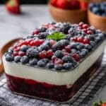 A rectangular glass dish filled with a three-layer dessert sits on a white marbled surface with a gray checkered cloth underneath. The bottom layer is a dark red berry compote with a thick, slightly wet texture. The middle layer is a smooth, thick white cream. The top layer is densely packed with fresh berries, including blueberries, raspberries, blackberries, and red currants, all dusted lightly with powdered sugar. A small green mint leaf is placed near the center on top of the berries. In the blurred background, some strawberries and wooden bowls with blueberries add depth to the scene. Photo taken with an iphone --ar 4:5 --v 7