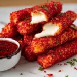 These Hot Cheeto Mozzarella Sticks are a spicy, crispy twist on a classic appetizer. Coated in crushed Flamin’ Hot Cheetos, they deliver a fiery crunch paired with gooey melted mozzarella cheese inside. Perfect as a snack or party appetizer, they can be cooked either by frying or air frying for a hot, cheesy treat served with ranch or blue cheese dipping sauce.