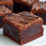 The image shows a close-up of several thick chocolate brownies placed on a white plate with a white marbled background. Each brownie features two main layers: a dense, moist, and dark chocolate base that looks rich and fudgy, and a thinner top layer that is slightly lighter brown and more cake-like, with glossy, dark chocolate drizzle lines running horizontally across the top. The edges of the brownies are crumbly, adding texture contrast. The focus is on one brownie in the front, highlighting its smooth top and textured sides, with other brownies slightly blurred in the background. Photo taken with an iphone --ar 4:5 --v 7