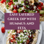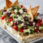 Keywords: Greek dip, layered dip, cream cheese dip, hummus dip, party appetizer, vegetarian dip