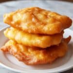 A stack of three golden-brown fried dough pieces sits on a white plate with a smooth surface, placed on a white marbled texture. The top dough is fluffy and slightly crispy, with an uneven, bumpy texture and a warm golden color. Below it, two similar pieces are stacked, showing soft edges and slight bubbling on their fried surfaces. The light captures the slight shine and texture variations on the dough, highlighting the crunchy outer layer and soft inside. photo taken with an iphone --ar 4:5 --v 7