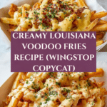 Delicious Louisiana Voodoo Fries, a Wingstop copycat recipe featuring crispy baked French fries topped with a creamy, spicy white cheddar cheese sauce seasoned with ranch, cayenne, and Cajun spices. Perfect as a flavorful appetizer or snack.