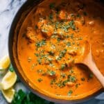 A close-up top view of a black pot filled with thick orange curry sauce that has chunks of food in it, sprinkled with green herbs on top. A wooden spoon is partially dipped into the curry, showing the creamy texture. Around the pot on a white marbled surface, there are fresh green cilantro leaves and yellow lemon wedges scattered loosely. Photo taken with an iphone --ar 4:5 --v 7