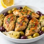 Keywords: Mediterranean chicken, lemon chicken, artichoke recipe, healthy chicken dinner, one-pan chicken, Kalamata olives, easy chicken recipes