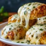 Four pieces of golden brown chicken breasts sit in a white plate, each topped with a thick, melted layer of white cheese that stretches as one piece is lifted, showing its gooey texture. Bright green chopped herbs are sprinkled on top of the cheese, adding a fresh contrast to the creamy white and golden colors. The white plate rests on a wooden surface with a blurred dark background, making the chicken and cheese the main focus. photo taken with an iphone --ar 4:5 --v 7