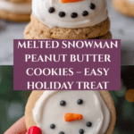 These Melted Snowman Peanut Butter Cookies combine a soft and chewy peanut butter base with festive melted chocolate decorations. Topped with white chocolate peanut butter cups and detailed with colored candy melts, these cookies are perfect for holiday celebrations and bring a fun, whimsical twist to classic peanut butter cookies.