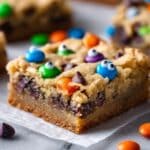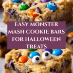 Keywords: Halloween cookies, cookie bars, candy cookie bars, festive dessert, chocolate chip bars, monster mash bars