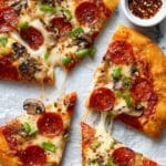 - Slice and Serve: Remove the pizzas from the oven carefully using oven mitts. Using a long chef’s knife or pizza cutter, create one vertical and one horizontal slice to divide each pizza into quarters. Sprinkle with red pepper flakes if desired and serve immediately, possibly accompanied by cheesy garlic bread for a complete meal.