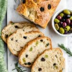 This no-knead olive bread is a rustic, flavorful loaf perfect for any meal. With a simple dough enriched by aromatic dried herbs and savory olives, it requires minimal effort and produces a crusty, soft-centered bread baked in a Dutch oven for a perfect artisan texture and appearance.