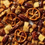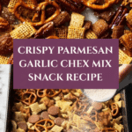 Parmesan Garlic Chex Mix is a savory, crunchy snack blend featuring a mix of corn Chex cereal, Goldfish crackers, mini pretzel twists, and Cheez-It crackers. Coated in a flavorful butter blend with Worcestershire sauce, seasoned salt, garlic, and onion powders, then baked to golden perfection and finished with grated Parmesan cheese, this mix is perfect for snacking, gifting, or party treats.