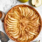 A round baked tart is shown from above, with a golden-brown crust forming the base layer. On top, thinly sliced pear pieces create a layered pattern covering the whole surface. The slices are arranged in curved, fan-like groups with a light golden and slightly browned color, dusted evenly with cinnamon powder that adds warm brown speckles. The tart rests on a white marbled surface, with a small jar of cinnamon next to it on the lower left and a silver pie server on the lower right. Above the tart, two halves of fresh pears are visible, partly cut and placed casually. Photo taken with an iphone --ar 4:5 --v 7