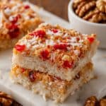 These Pineapple Coconut Cherry Dream Bars feature a buttery cookie crust topped with a sweet and tangy pineapple coconut filling studded with crunchy walnuts and maraschino cherries. Baked to golden perfection, they make a delightful tropical-inspired dessert or snack.