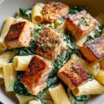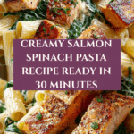A creamy and flavorful Salmon Spinach Pasta combining tender seared salmon, fresh spinach, and a rich Parmesan cream sauce, tossed with perfectly cooked fettuccine or linguine. This dish brings together bright lemon zest and juice for a fresh finish and optional red pepper flakes for a subtle kick, making it a comforting yet elegant meal perfect for any night.