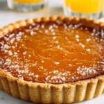 A golden brown tart with a thick, crumbly crust that has a slightly rough texture and scalloped edge surrounding a glossy, amber-orange filling. The filling is smooth and shiny, with a surface that has subtle cracks and is sprinkled lightly with coarse white crystals, likely sugar or salt. The tart is placed on a white marbled surface with two blurred glasses of yellow liquid in the background. Photo taken with an iphone --ar 4:5 --v 7