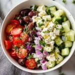 Keywords: Greek salad, feta cheese, cucumber salad, Mediterranean salad, healthy salad, no-cook recipe, fresh salad, olive oil dressing