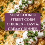 Slow Cooker Street Corn Chicken is a creamy, flavorful dish that combines tender chicken with the smoky, tangy flavors of street corn. It’s easy to prepare and perfect for a comforting weeknight meal.