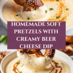 Soft Pretzels with a rich and creamy Beer Cheese Dip is the ultimate savory snack perfect for parties or cozy nights in. Homemade pretzels are boiled in a baking soda bath to achieve their signature chewy crust and golden color, then baked to perfection. Paired with a smooth, flavorful beer cheese dip made from sharp cheddar, Dubliner cheese, and a touch of spices, this recipe combines classic flavors for an irresistible treat.