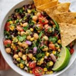 Keywords: chickpea salad, black bean salad, southwest salad, vegan salad, no cook salad, lime dressing, fire roasted corn, healthy salad