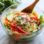 Spring Roll Salad with Spicy Ginger Dressing is a refreshing and vibrant dish featuring rice vermicelli noodles combined with fresh vegetables and herbs, all tossed in a flavorful, zesty dressing made from grated ginger, soy sauce, rice vinegar, honey, sesame oil, and chili sauce. Perfect as a light meal or a side, this salad offers the crisp textures and bold tastes reminiscent of traditional spring rolls in a convenient, no-wrap format.