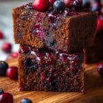 A close-up shows a thick square piece of dark brown fruitcake with a moist texture full of red cranberries and dark dried fruits inside. The top layer glistens with slightly melted bright red berries, adding a juicy look. The cake is stacked with another piece behind it, both resting on a wooden board with scattered fresh cranberries and blueberries around. The background is softly blurred with warm tones, highlighting the rich color and texture of the cake. Photo taken with an iphone --ar 4:5 --v 7