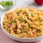 - Add vegetables and cheese: Incorporate the diced green onions, red bell pepper, drained corn, and shredded Mexican blend cheese into the pasta mixture. Gently toss again to combine all ingredients evenly.
